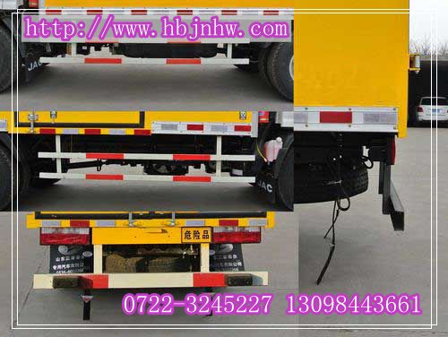 江淮4噸爆破器材運輸車生產(chǎn)制作說明:整車廂體采用軍工技術(shù)制造的全金屬整體骨架結(jié)構(gòu),強度高,載荷分布均勻,整體的安全性、通過性、平順性好;板塊夾層裝有阻燃隔熱材料,防火阻燃性好。廂體外蒙皮采用1.2mm厚的優(yōu)質(zhì)冷軋鋼板,利用新型對接工藝,配合特制的上、下護(hù)板、前立柱鋁型材和不銹鋼前上包角、前下包角及尾翼等裝飾件,使廂體外觀更加精致、美觀、大方。外露黑色金屬部分全部進(jìn)行防銹處理,廂體內(nèi)蒙皮防水膠合板表面涂刷防火漆進(jìn)行防火處理。在廂體兩側(cè)設(shè)置具有防雨水功能的通風(fēng)窗,后門密封元件為采用進(jìn)口三元乙丙橡膠原料制作的工字型密封條,后門五金件利用國產(chǎn)廂式運輸車高檔通用五金件。